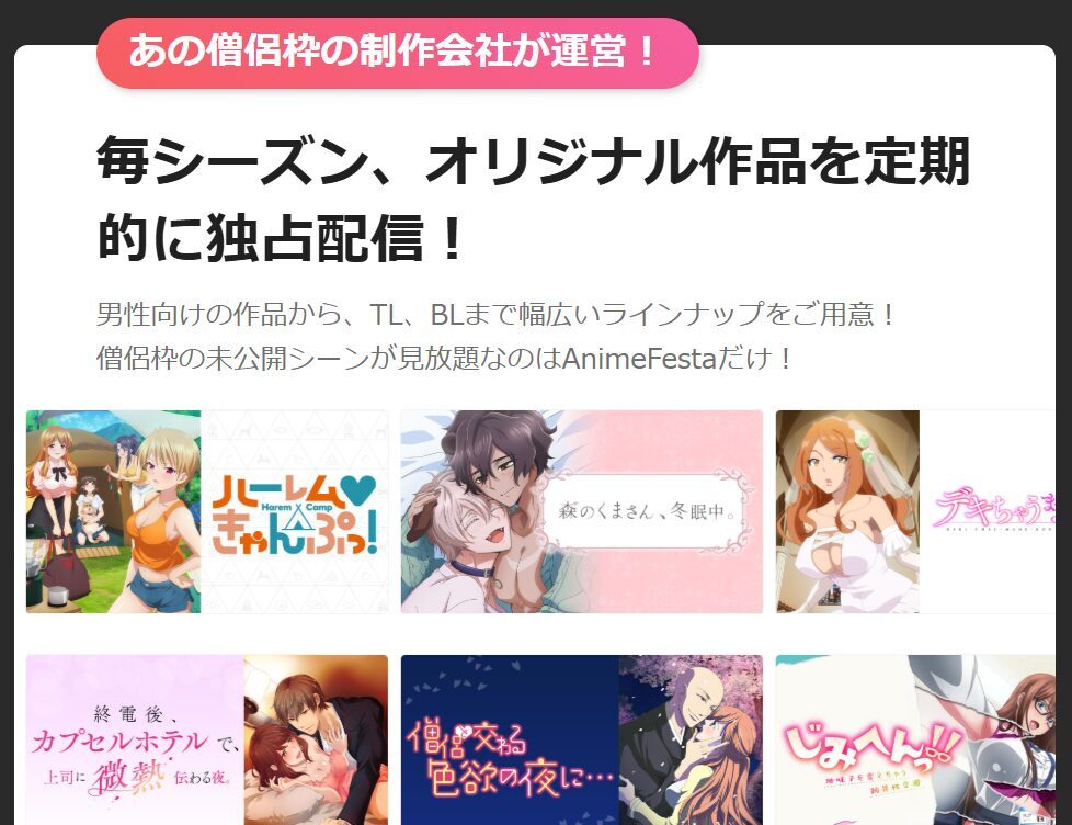 2017年の『僧侶と交わる色欲の夜に…』の放送以来、このジャンルを開拓し続けてきた株式会社ウェイブ(WWWave)は、自社で運営する公式配信サービス「AnimeFesta(アニメフェスタ)」を持っています。